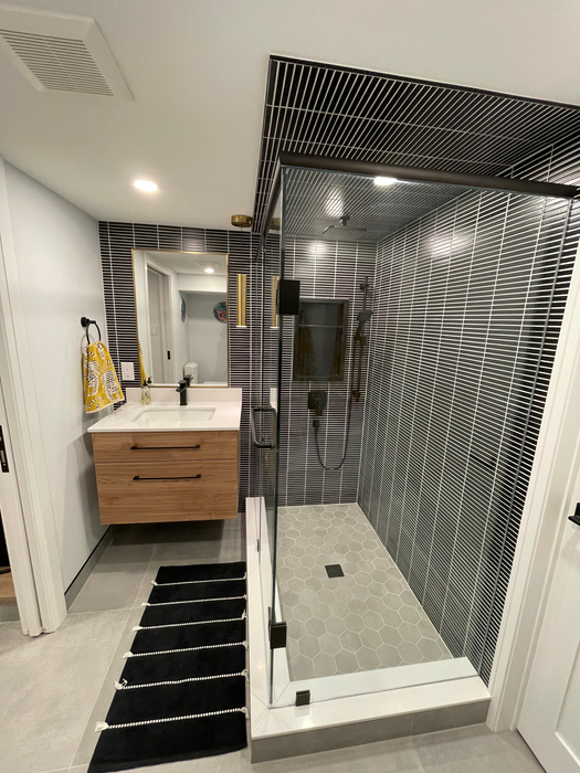 What began as a mysterious growth behind a basement wall turned into a full transformation for this century-old home in the heart of High Park. After uncovering a burst clay pipe and outdated infrastructure, we tackled a full sewer upgrade before rebuilding the space with a fresh, functional design. Custom cabinetry, a floating vanity, smart storage under stairs and bulkheads, and a sleek pocket-door bathroom with glass and tile finishes all maximize usability. With new lighting, flooring, and thoughtful layout changes, this cozy basement now offers a beautiful family retreat with storage, entertainment space, and a stunning bathroom that’s become the home’s new showpiece.